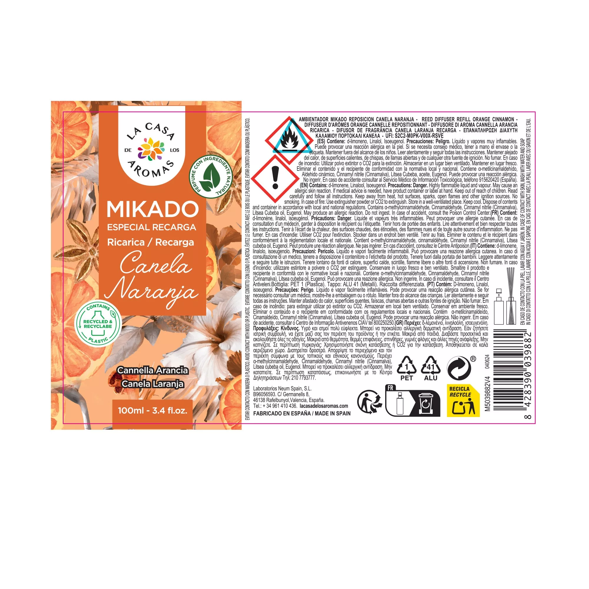Tenemos a tu disposición los mikados de reposición para poder rellenar el mikado con la esencia escogida. La combinación de la canela con la naranja da como resultado una fragancia aromática, un tanto dulce pero con la acidez que le otorga la naranja.
