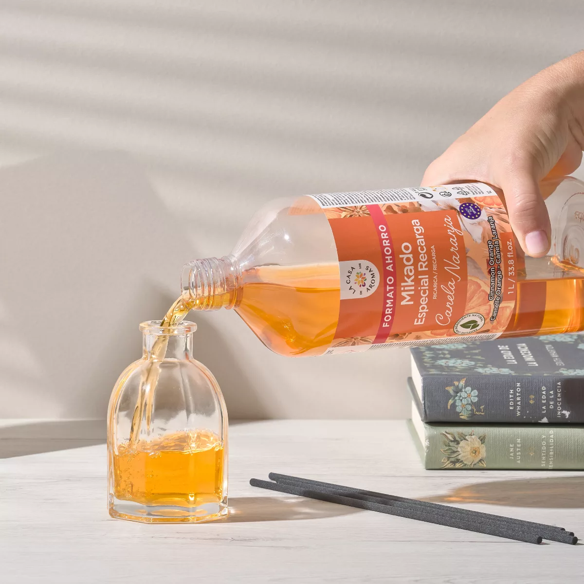 Rellenar su recipiente habitual de mikado con la reposición de mikado. Colocar las varillas nuevas en el recipiente para que absorban y desprendan la fragancia por toda la habitación. Colocar en un lugar ventilado para difundir mejor el aroma por toda la estancia.