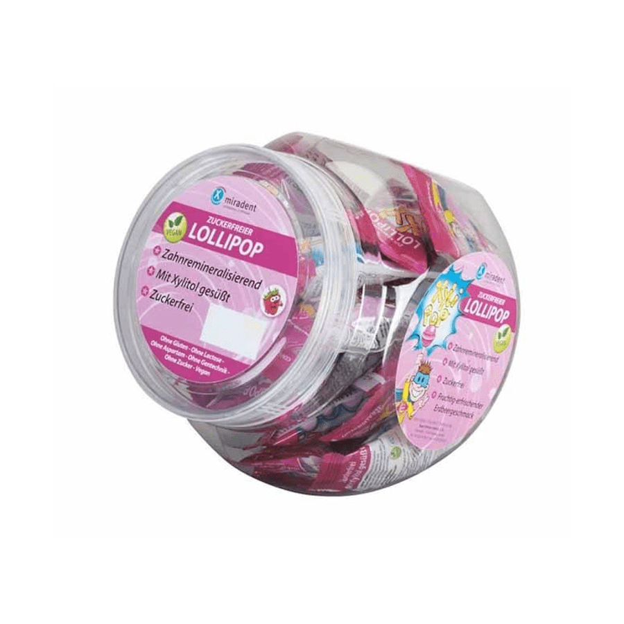 Estupendo expositor bombonera de caramelos sin azúcar con xilitol XyliPOPS, sabor fresa. Ideales para los niños.