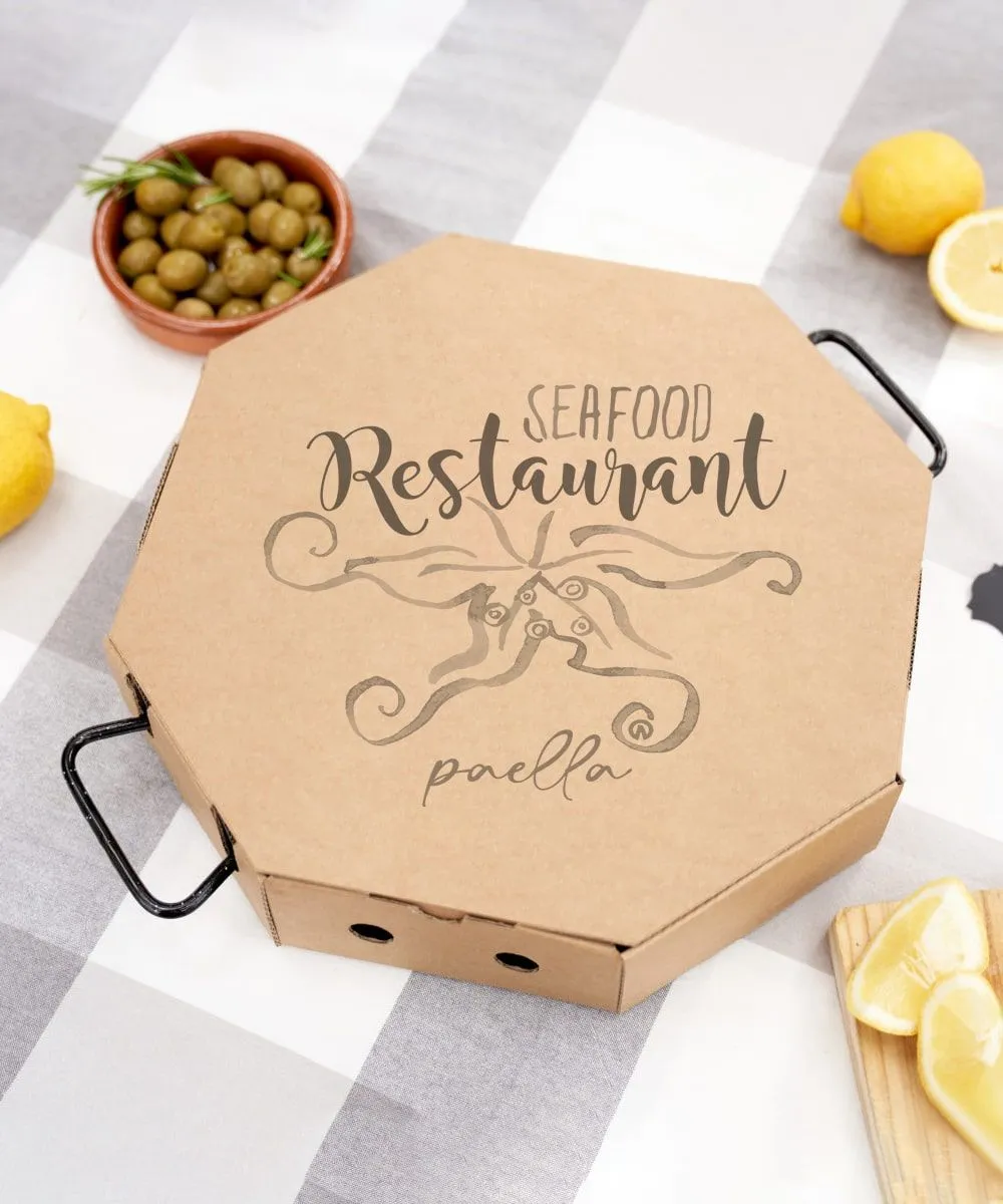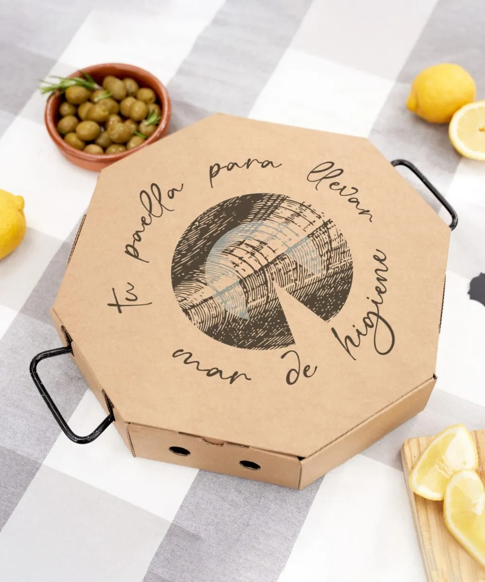 Cajas para llevar paellas personalizadas, especialmente diseñadas para recogidas en local o envíos a domicilio. Muy útiles para evitar quemar o manchar el vehículo durante el transporte de paellera. Si preparas paellas para llevar a domicilio encontrarás en estas cajas de cartón un envase muy completo y útil para su transporte con seguridad.