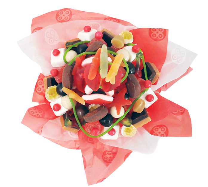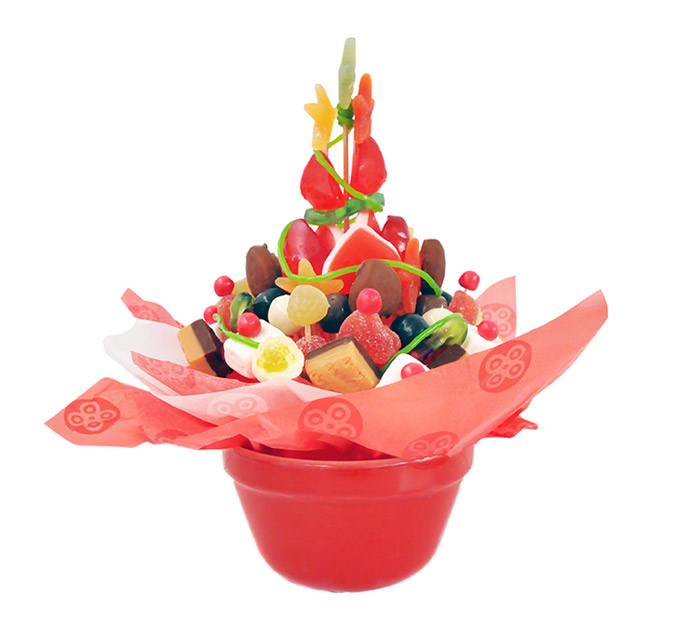 Centro de chuches con envase de cerámica roja, perfecto para Navidad. Está compuesto por un surtido de golosinas variadas, desde los toffees de vainilla chocolate, pasando por los corazones de espuma recubierta de chocolate con leche o las gelatinas de frambuesa o fresa, entre otras.