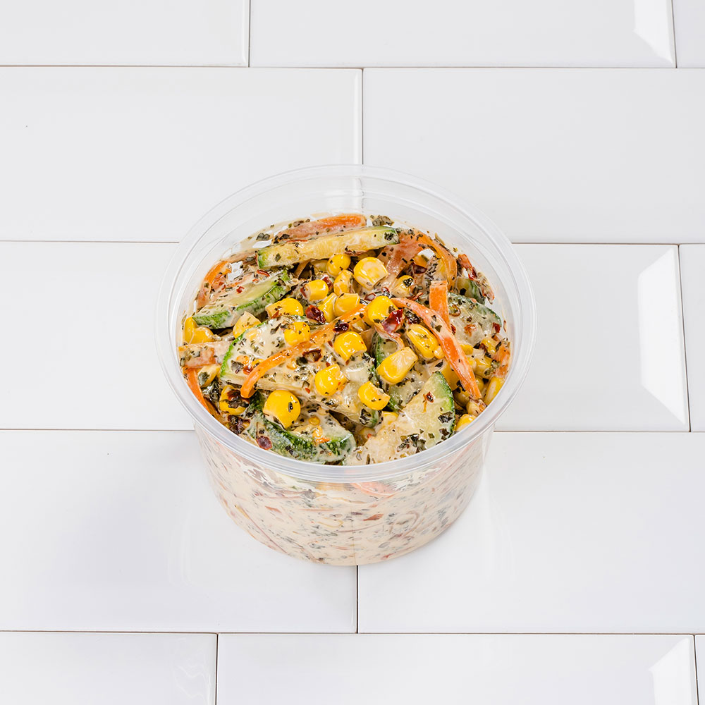Nuestra Ensalada Campestre combina trozos de zanahoria, cebolla, calabaza, elote, chile morrón, albahaca, toque de mayonesa.