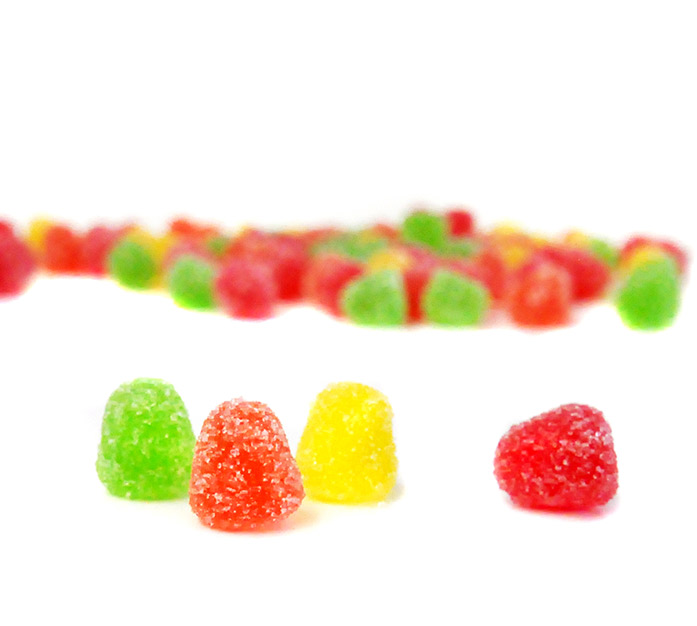 Surtido de mini gelatinas blanditas en tonos verdes, amarillos, naranjas y rojos, recubiertas de azúcar y con un intenso sabor a verano. Son primas hermanas de nuestra clásica Geléhallon pero en versión mini.