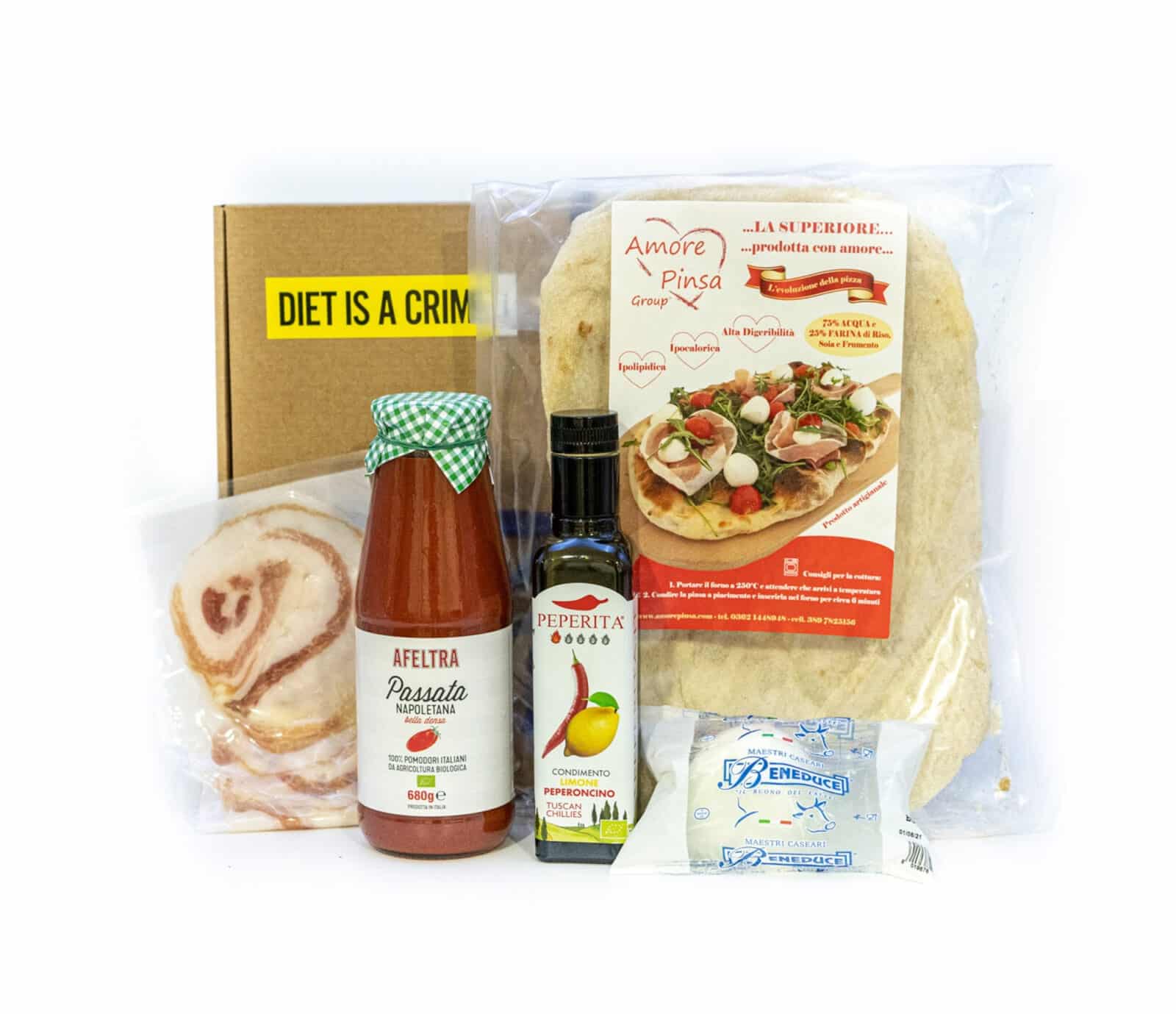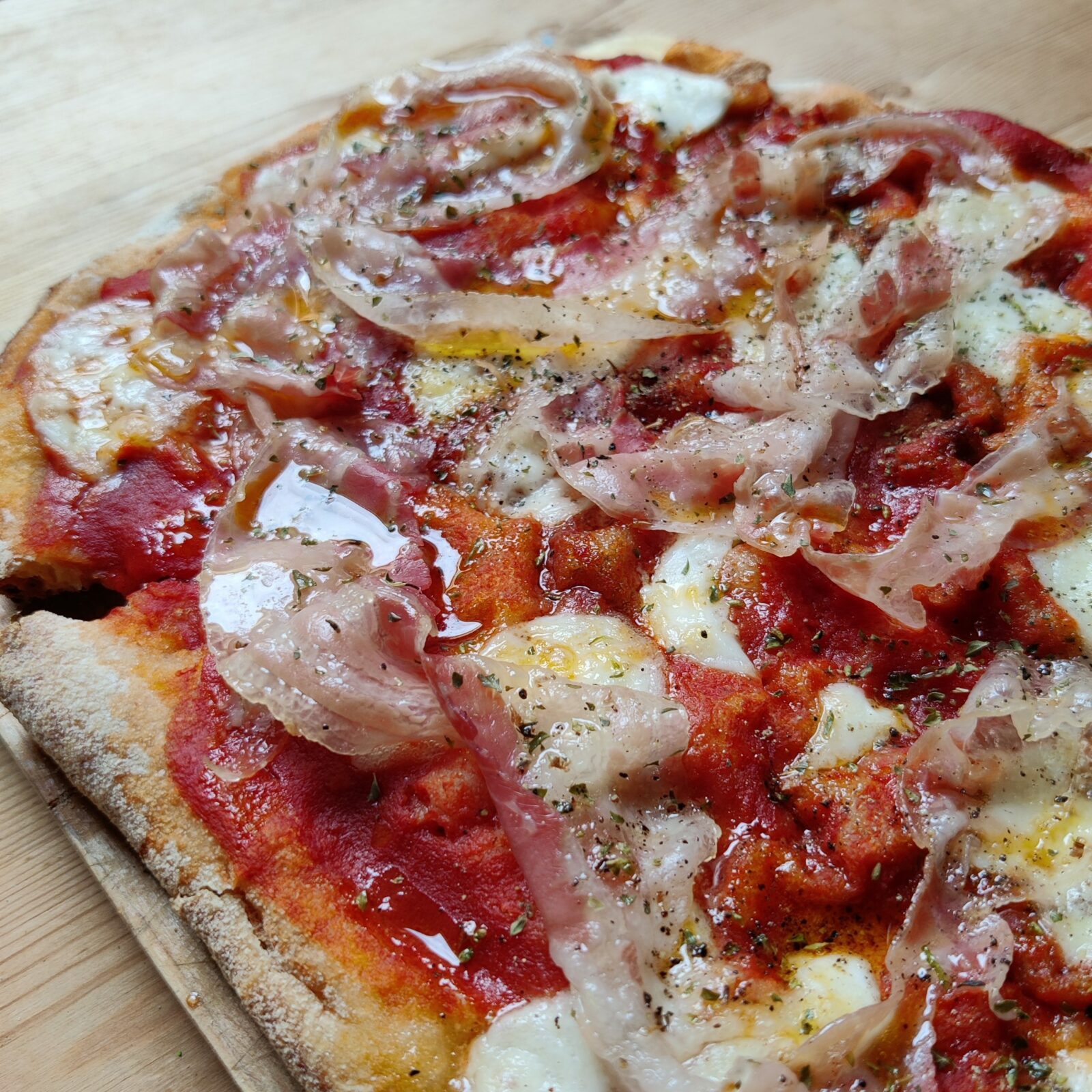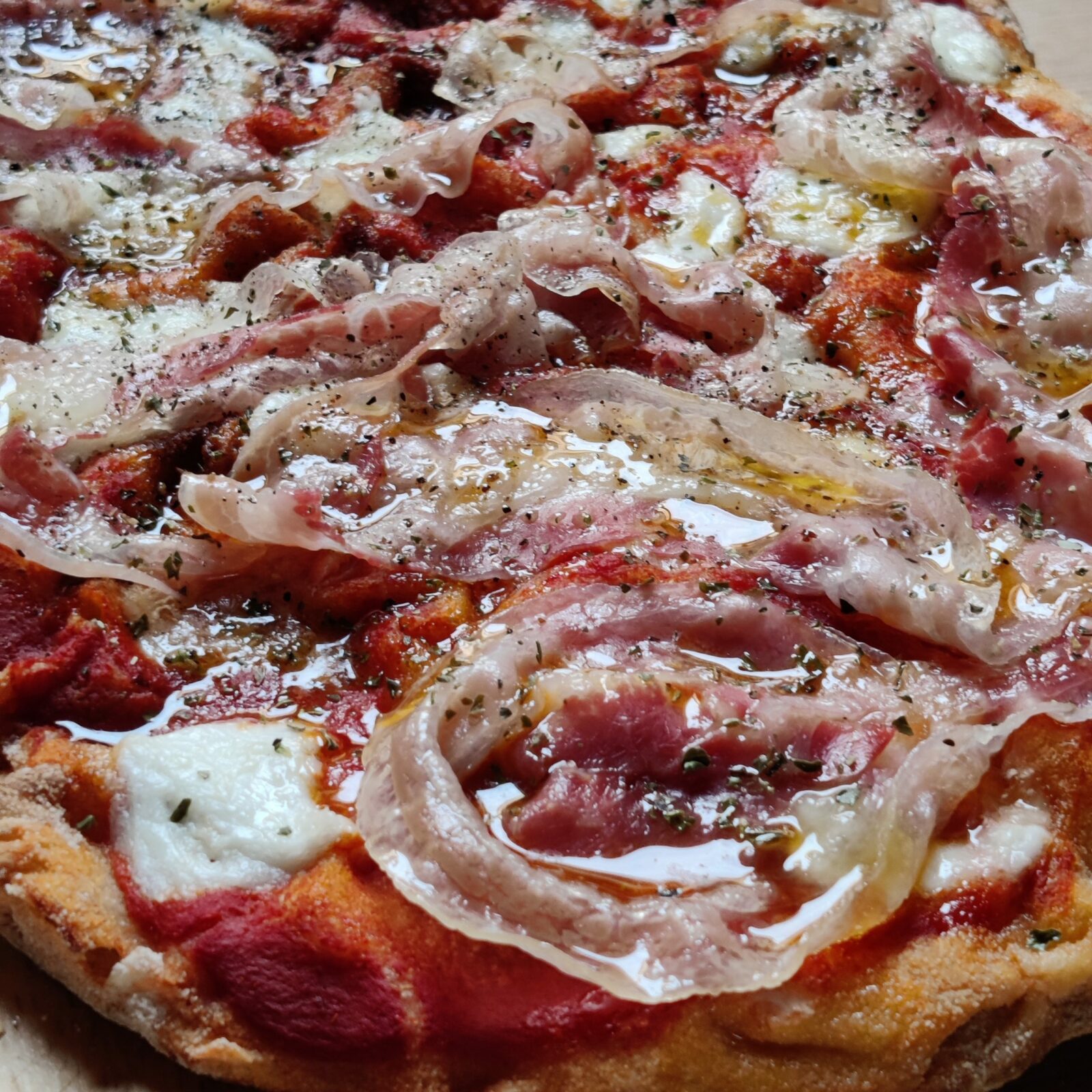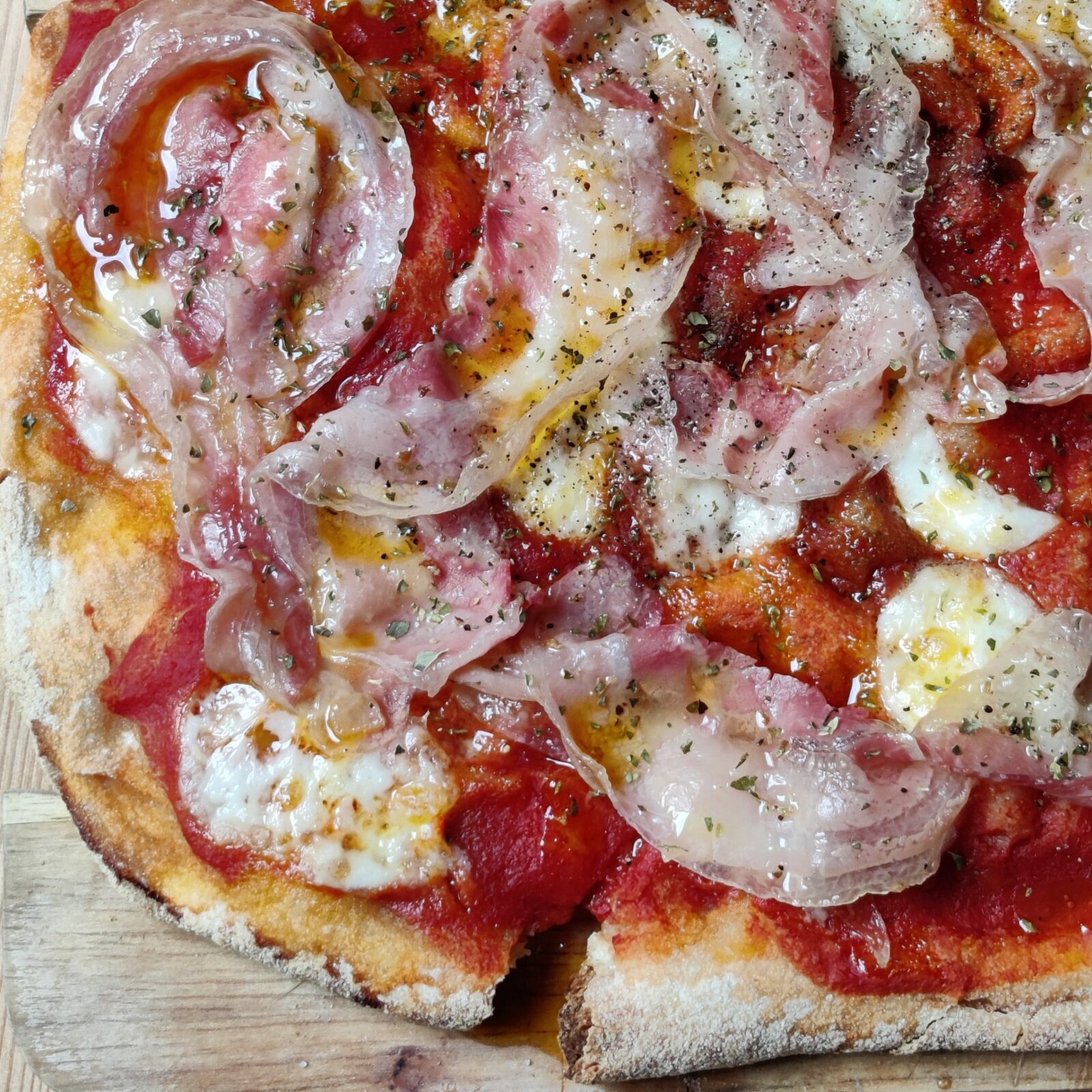 Preparacion: exceder el horno a 250 grados. Poner el tomate en la pizza, la mozzarella cortada en trozos, el aceite de limon y hornear. Despues de 4/5 minutos poner la pancetta y terminar la cocción. Cuando los bordes de la pizza están dorados y la mozzarella fundida, la pizza está lista.
