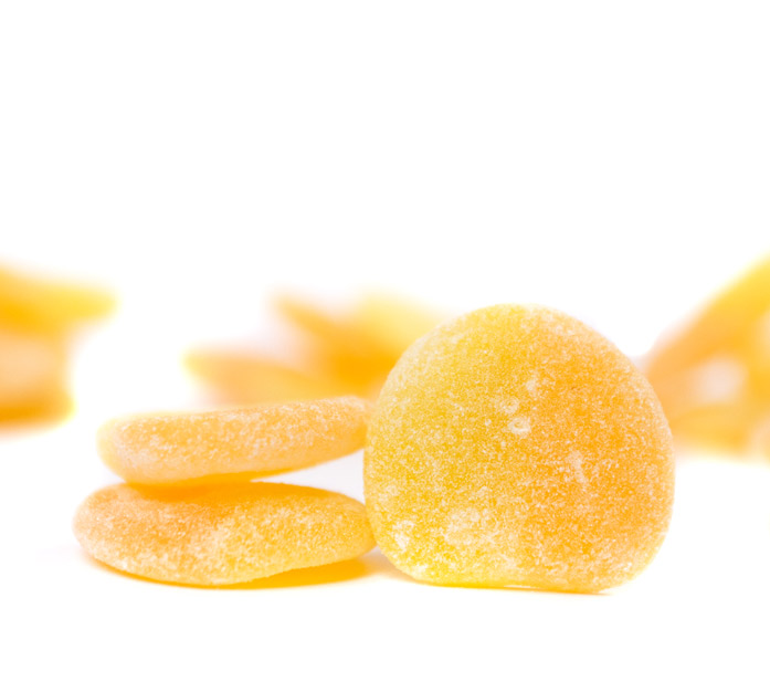 Gelatina mitad amarilla y mitad naranja, con un intenso sabor a melocotón y recubierta con un toque de azúcar. Tiene un sabor delicioso que gusta tanto a pequeños como grandes.