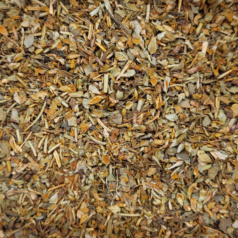 Las especias para pizza se presentan en forma de hojas cortadas con un aspecto correcto y un color verdoso. Contiene: orégano, albahaca y tomillo.