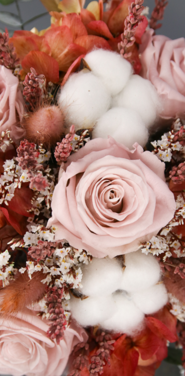 Ramo de Novia con flores preservadas elaborado con rosas en tonos rosas empolvadas, hortensias anaranjadas y la suavidad del algodón se entrelazan en este ramo especial.