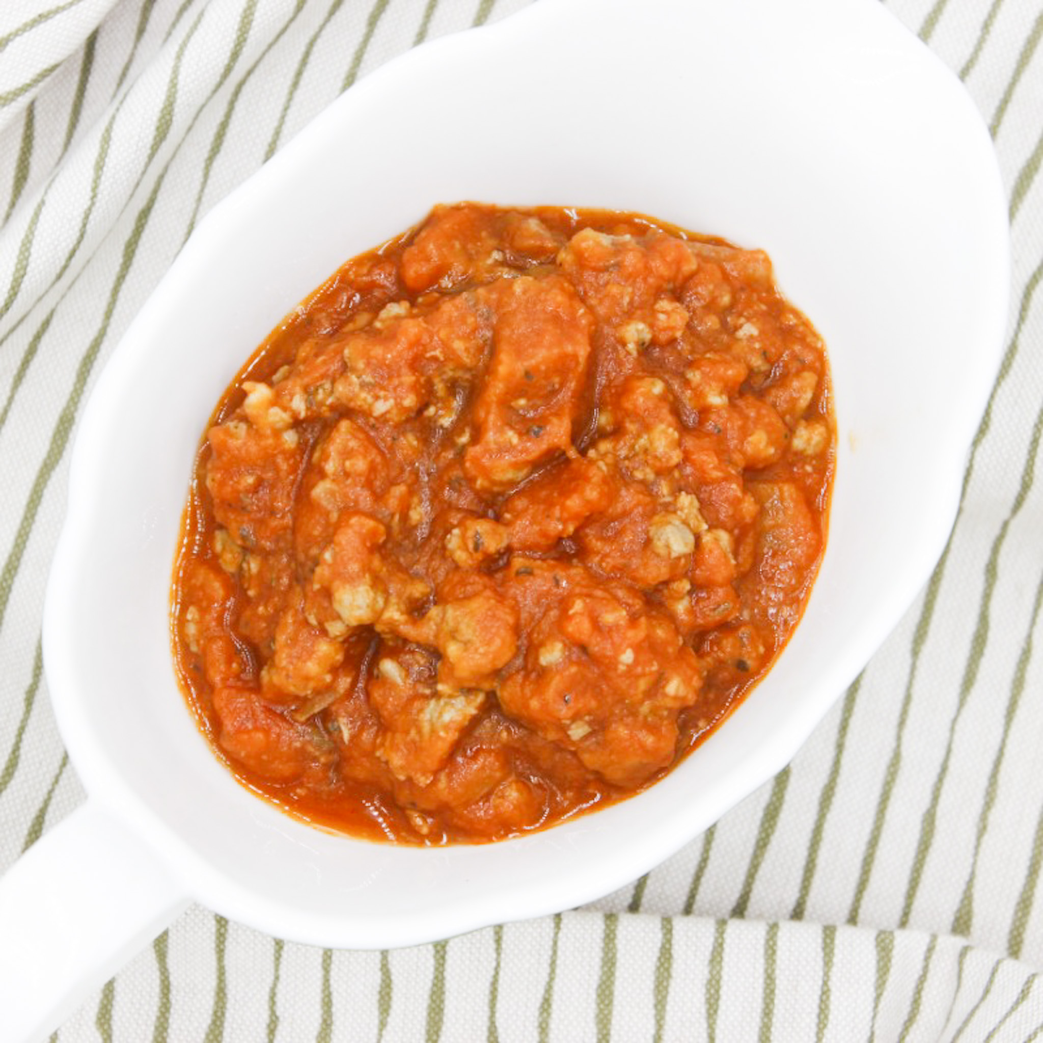 Salsa de tomate (tomate triturado (tomate, sal, acidulante: ácido cítrico), tomate frito (tomate, almidón de maíz, aceite de girasol, azúcar, sal, acidulante: ácido cítrico, ajo, cebolla), cebolla, aceite de oliva, zanahoria, azúcar, sal), ternera, cebolla, aceite de oliva, sal, albahaca, orégano.