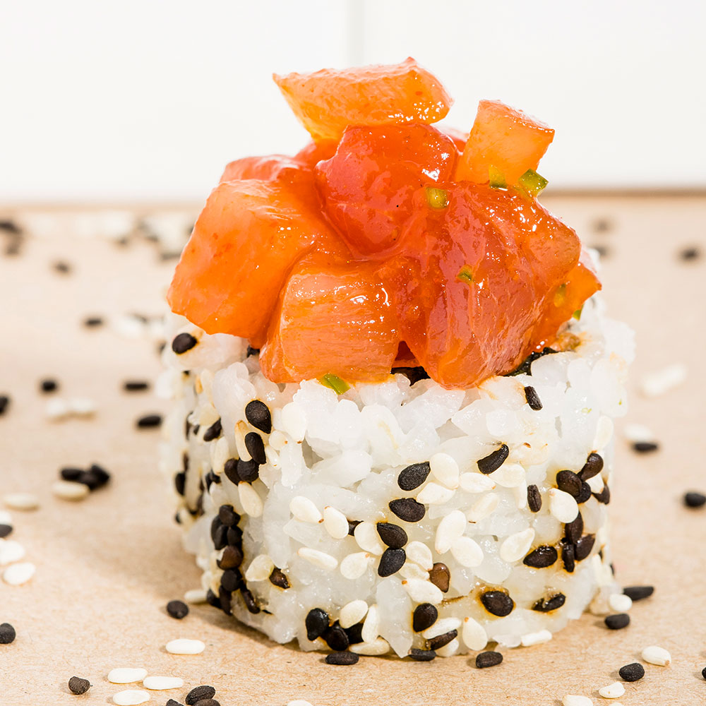 Una mezcla vibrante de sabor y textura. Este rollo combina trozos de salmón marinados en salsa picante con el crujiente inesperado de zanahoria y betabel en tempura. Todo envuelto en arroz con una capa de ajonjolí blanco y negro, y coronado con una generosa porción de tartar spicy. Un rollo atrevido, colorido y lleno de personalidad.